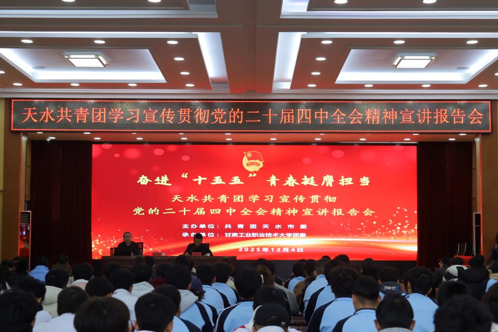 12月4日,天水共青团学习贯彻党的二十届四中全会精神宣讲报告会在我校举行。市委讲师团成员、市青年讲师团成员、市委党校哲学与科学社会主义教研部主任、副教授侯强强应邀作专题宣讲。我校团委负责同志、青年教师代表、全市基层团干部等共计200余人现场聆听报告。